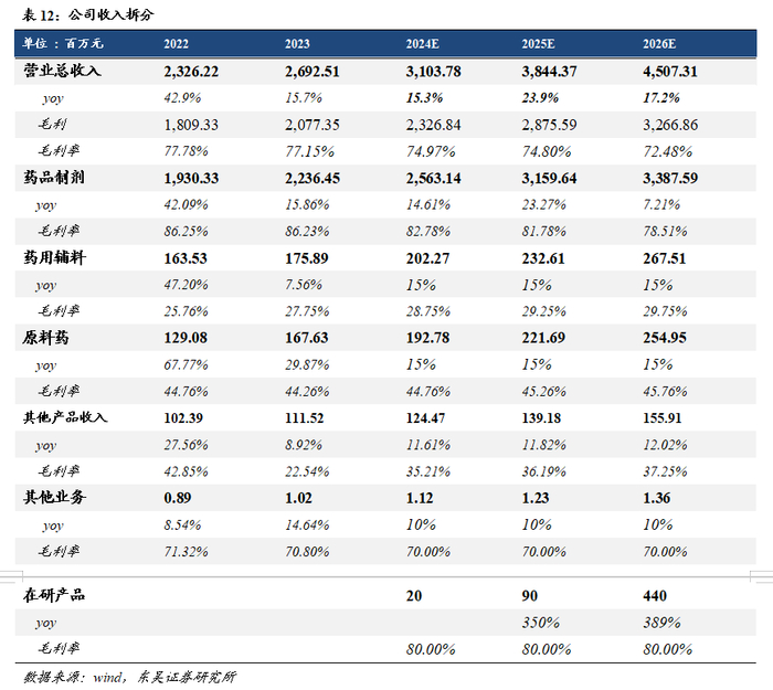 3)原料药:考虑到原料药品种数量增加、规模扩大,假设2024-2026年收入增速分别为15%、15%、15%,毛利率分别为44.76%、45.26%、45.76%。