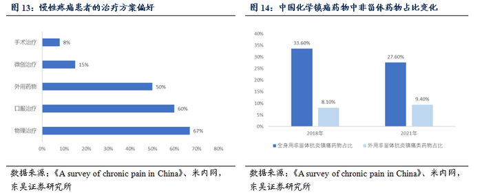 慢性疼痛治疗率、满意度低,外用镇痛类产品成为优选方案之一。根据《中国疼痛医学发展报告(2020)》,全国三甲医院不到300家建制完整疼痛科室,70%疼痛患者分布在基层市场。目前中国慢性疼痛的诊治现状极不乐观,疼痛知晓率仅14.3%,就诊率不足60%,治疗后完全缓解率不足20%,治疗满意度仅8.89%。而针对于慢性疼痛患者的调研显示,50%的患者偏好外用药物治疗。疼痛管理空白市场有待挖掘,外用贴膏贴剂产品在疼痛领域具备广阔发展空间。