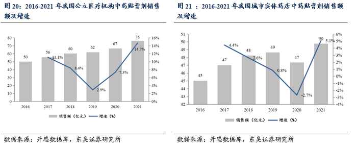 中国外用贴膏市场规模上百亿,传统中药贴膏占据主导,化药贴膏增长快、份额快速提升。根据米内网数据,2021年外用贴膏剂的市场销售规模约180亿元,同比增长17.81%。其中,中成药贴膏剂占比超70%,化学药贴膏剂占比不到30%。但化学药贴膏增长迅速,在医院端、零售端的同比增速分别为40.66%、22.85%, 而中成药贴膏在医院端、零售端的同比增速分别为14.67%、6.60%。传统中成药贴膏存在载药量低、药理不明、副作用大等问题,随着凝胶贴膏新型制剂上市,化药贴膏市场将保持快速增长。