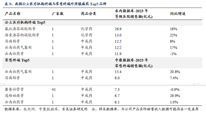 根据药智网数据,中国上市透皮贴剂处方化学药涉及30种单方或复方活性成分,化学药的品牌竞争数量整体较少,仅硫酸新霉素+醋酸曲安奈德、可乐定、硝酸甘油上市品牌数大于5家,竞争数量相对较多。参考海外市场,芬太尼贴剂自1991年在美国上市以来,其销售峰值达到了22亿美元,拥有处方及OTC两大销售市场,在疼痛等领域具备不可替代性的地位。根据米内网与中康数据库,2023年国内市场销售额最高的品种为氟比洛芬凝胶贴膏,终端销售额超30亿,同比增长超15%,可见未来化药贴膏贴剂产品仍具备大单品爆发潜力。