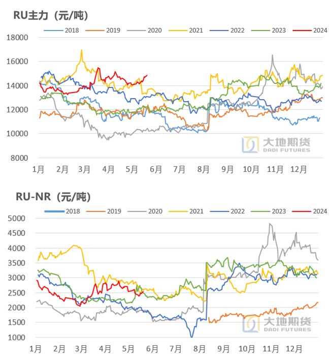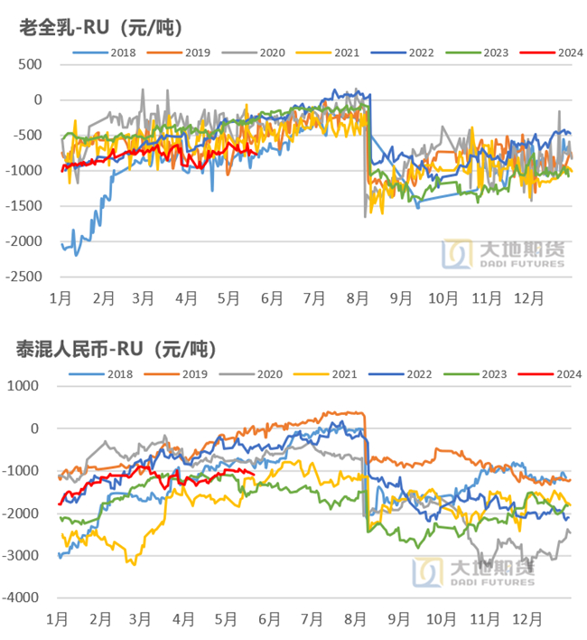 RU对老全乳溢价偏高。RU对老全乳的基差来看,处于近几年历史偏高位置,主要原因一是今年RU存在一定的金融溢价,包含了对宏观情绪、长周期供需预期的计价,产业外资金参与较多;二是现实老全乳去库速度偏慢,浅色胶需求仍然是偏弱,导致现实端较弱。