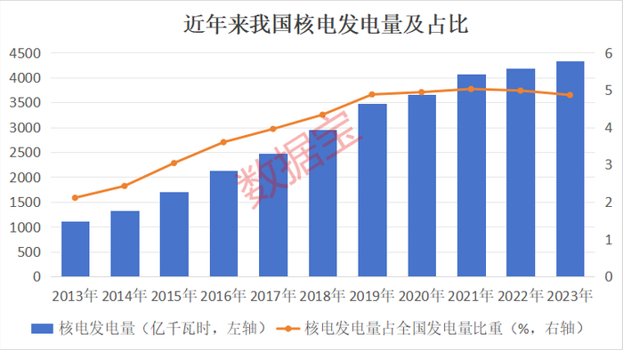 据中国电力企业联合会数据,我国2023年核电发电量达到4332.6亿千瓦时,近10年复合增长率达14.63%,占全国发电总量的比例达到4.86%,较10年前大幅提高2.75个百分点。根据《中国核能发展与展望(2023)》并综合多家机构的研究成果,预计到2035年,我国核电发电量的占比将达到10%,存在较大增长空间。