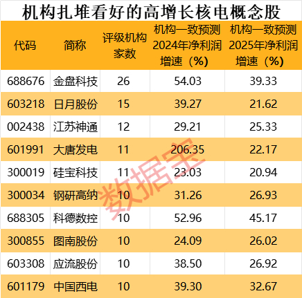 据证券时报·数据宝统计,核电概念股中10股获10家及以上机构积极型(含买入、增持、强烈推荐等)评级且机构一致预测2024年、2025年净利润增速均超20%。