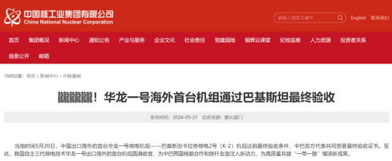 据中核集团消息,当地时间5月20日,中国出口海外的首台华龙一号核电机组——巴基斯坦卡拉奇核电2号(K-2)机组达到最终验收条件,中巴双方代表共同签署最终验收证书。