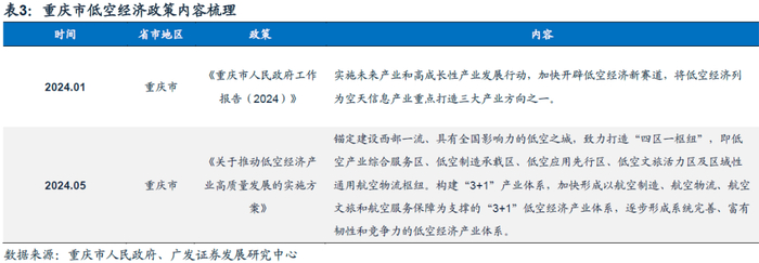 1.基础设施:2022年,两江新区获批全国民用无人机驾驶航空试验区,龙兴通用机场、两江机场公司等软硬件配套设施完善,根据重庆市人民政府,2023年,重庆成为国产通用航空装备物流运输领域创新应用试点地区,首批构建总计6个低空经济先行试验区。2024年1月,开通5条短途运输试点航线,初步构建起联通渝西、渝东南和渝东北的空中网络。2024年3月,重庆市与四川省签署全国首个跨省低空合作备忘录,共同开辟西南地区首条跨省低空目视航线并于3月13日首飞。