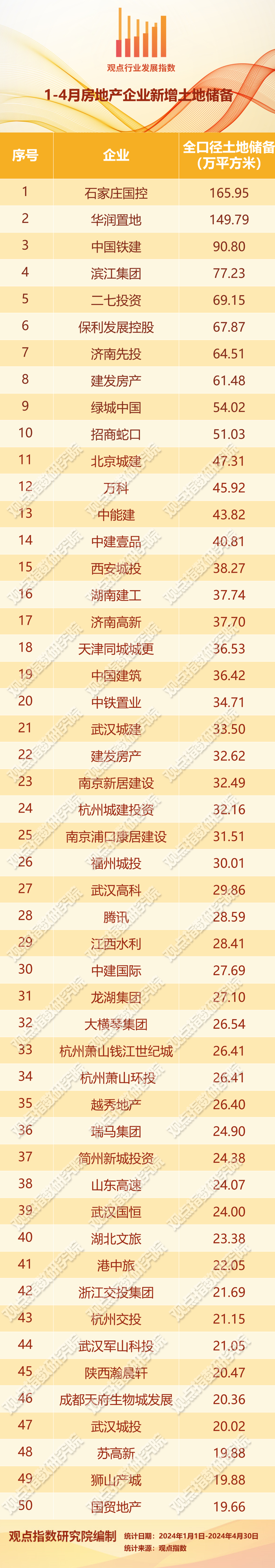 1-4月前50房企新增土地建筑面积2017.71万平方米,同比下降11.52%。其中,石家庄国控、华润置地、中国铁建新增全口径土地储备分别为165.95万、149.79万以及90.8万平方米,处于领先位置。华润置地4月新增42万平方米。