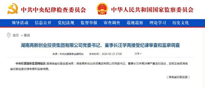 5月23日,中央纪委国家监委网站发布消息,据湖南省纪委监委消息:湖南高新创业投资集团有限公司党委书记、董事长汪学高涉嫌严重违纪违法,目前正接受湖南省纪委监委纪律审查和监察调查。