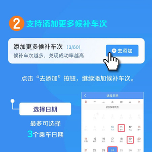 一是增加候补订单数量。每名旅客可提交的待兑现候补订单数量由2个增至6个,每个订单最多可添加9名乘车人。