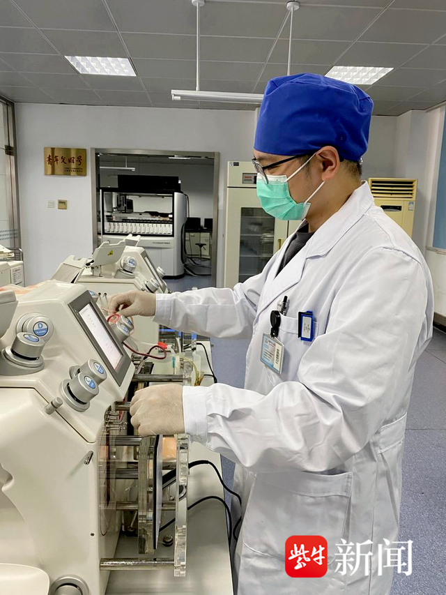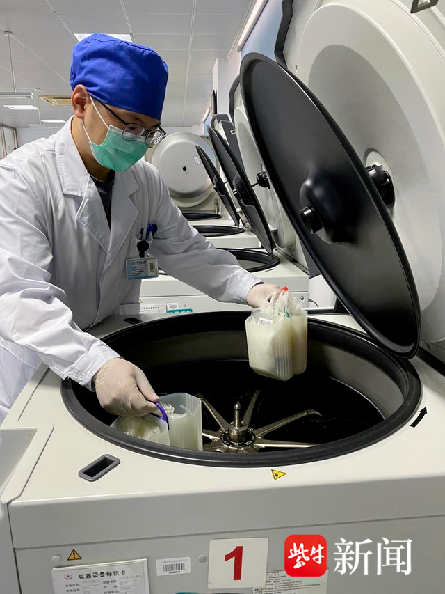锁定目标后,这份珍贵的血液从红细胞储存库中被取出,并放进专业化浆机中融化好血浆。随后,从家中赶来的成分制备值班人员王皓亮接手进行紧急血液制备。新生儿合成血的制备比较特殊,王皓亮严格按照操作流程,离心、分离......重复上述过程2次,最后再加入200毫升新鲜冰冻血浆。