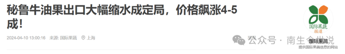 近日,秘鲁媒体报道,受高温和降雨影响,2024年秘鲁牛油果产量将达到56万吨左右(同比减少20-25%),其价格较去年将上涨4-5成。我国作为牛油果进口大国,其中71%来自秘鲁,此消息一出,必会导致我国牛油果价格再次疯涨。有网友直呼,“又要来收割了!”