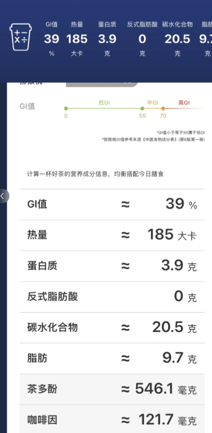 配料表显示,这款饮品含有咖啡因约121.7毫克,茶多酚约546.1毫克。