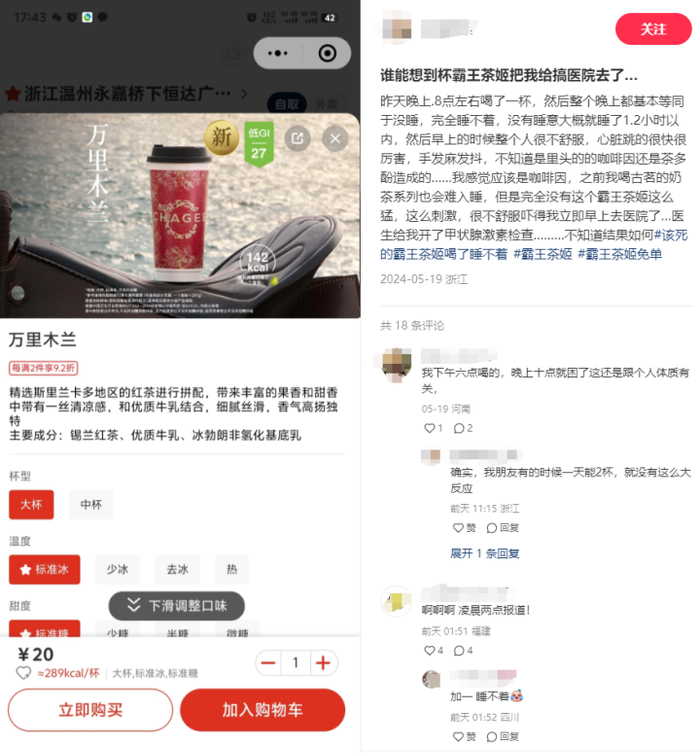 很多网友表示,不只是霸王茶姬,很多茶饮咖啡品牌都堪称“失眠神器”。