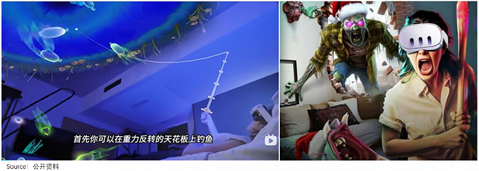 比如,Quest3新上架的《PILLOW枕头》就像XR版的漂流瓶,可以在重力反转的天花板上钓鱼、拆信;《Drop Dead:The Cabin》游戏中,僵尸甚至会进到玩家房子里,进行袭击。
