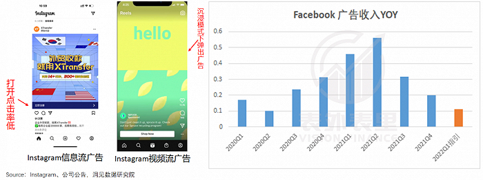 可以看到,Ins引入Reels短视频广告之后,广告收入增速持续下滑,甚至2022Q1给出历史新低的指引。