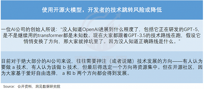 说白了,开源生态会让全世界的机构和研究员都参与进来,给大模型的迭代和进化免费“打工”。