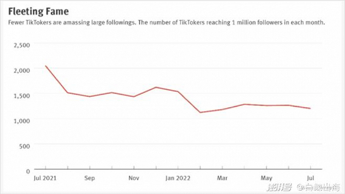 数据显示,2021年7月-2022年7月,TikTok上超百万粉丝的创作者数量从2000左右,下降至1200-1300,流失了近800人。