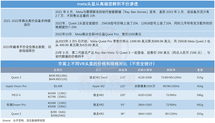 可以看到,Meta的头显正从主打高端走向大众化:新推出的Quest3,起售价499美元,行业内同等规格下相当便宜;与此同时,旧款也在陆续降价。