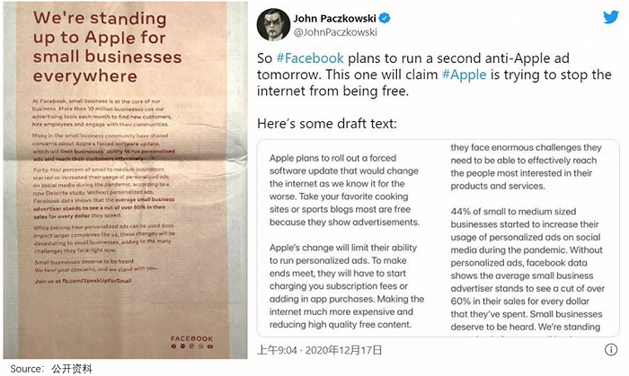 2020年12月,Facebook一口气在《纽约时报》《华尔街日报》《华盛顿邮报》上打了三整版广告,宣称“要为世界各地小企业站出来反对苹果霸权”。