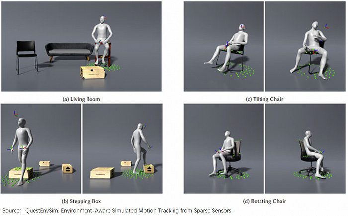 而利用AI算法,不仅能实现“四肢自由”,还能更准确预测全身动作。如当数据显示用户身下是一把椅子时,可以预测其向下的姿势不一定为下蹲,而是坐到椅子上。