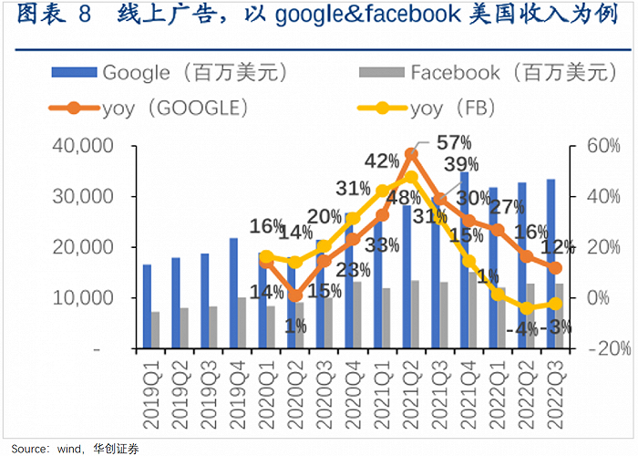 如下图,2021Q2之后,Meta、谷歌的广告收入增速都有下滑,但Meta的下滑幅度远大于以搜索广告为主的谷歌。