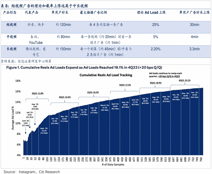 如下图,广告加载率一直处于上升状态。花旗集团分析表示,Reels 2024Q1的平均广告加载率已经达20%。