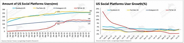 种种因素叠加影响下,可以看到,2023年初开始,TikTok的用户增速就基本处于四家末尾。