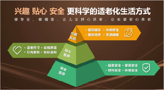 尚品宅配“活力长辈”系列产品从功能价值、情绪价值两大维度出发,规划了兴趣系统、贴心系统、安全系统三大核心产品系统。