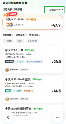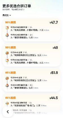 此外,顺路订单推荐列表也越来越人性化,比如乘客的顺路车主推荐列表,不仅可以看到每位车主的顺路程度、好评率、接单次数,还可以看到车主几分钟在寻找乘客。同时,支持根据“距我最近”、“最早出发”、“出行最多”等逻辑进行订单智能排序。