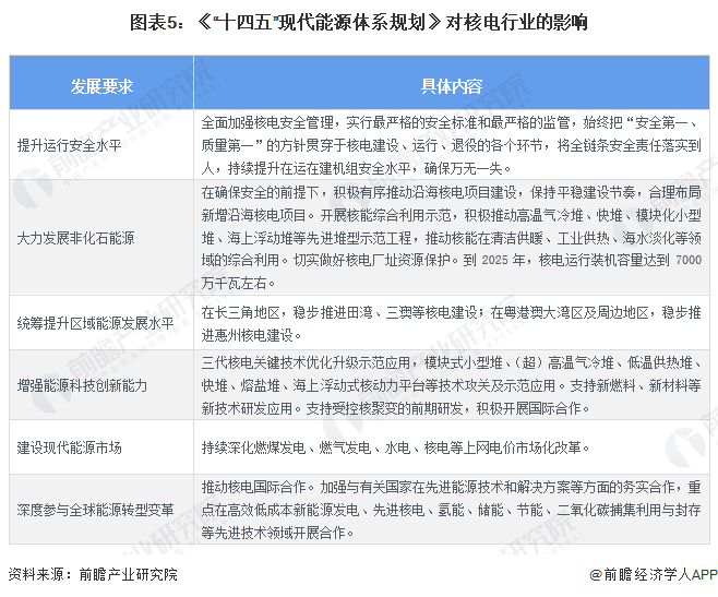 核电是建设清洁低碳和安全高效的能源体系的重要组成部分,在“十二五”规划中国家的发展要求是高效发展并重点布局沿海地区,“十三五”规划在此基础上提出要加速开发新一代核电装备和系统,“十四五”规划要求安全稳妥推动沿海核电建设。