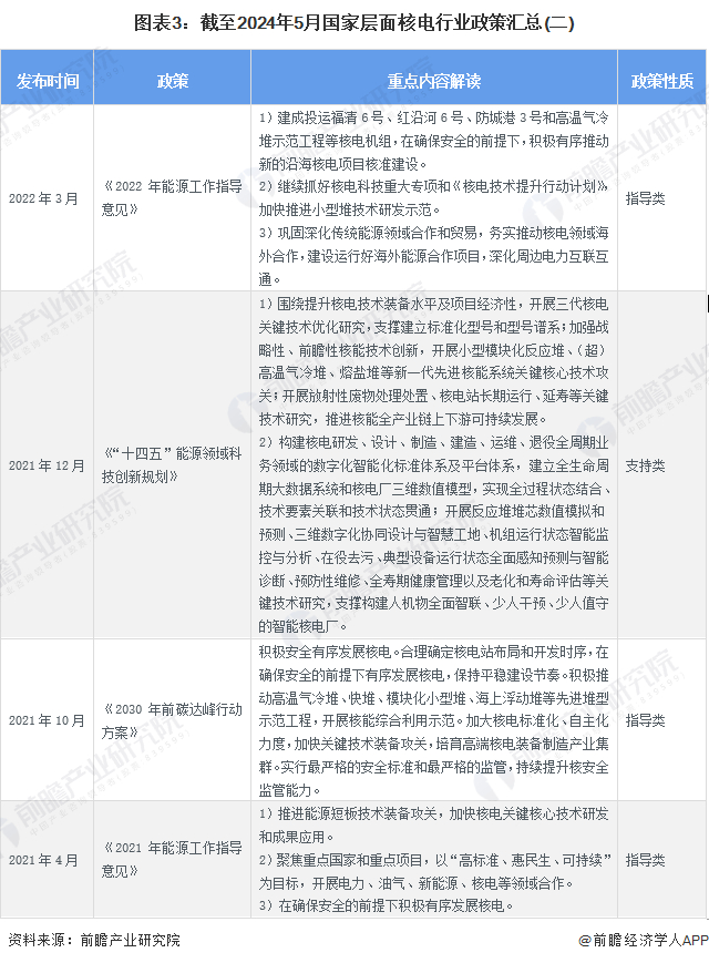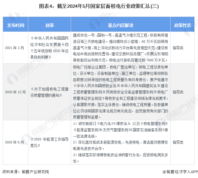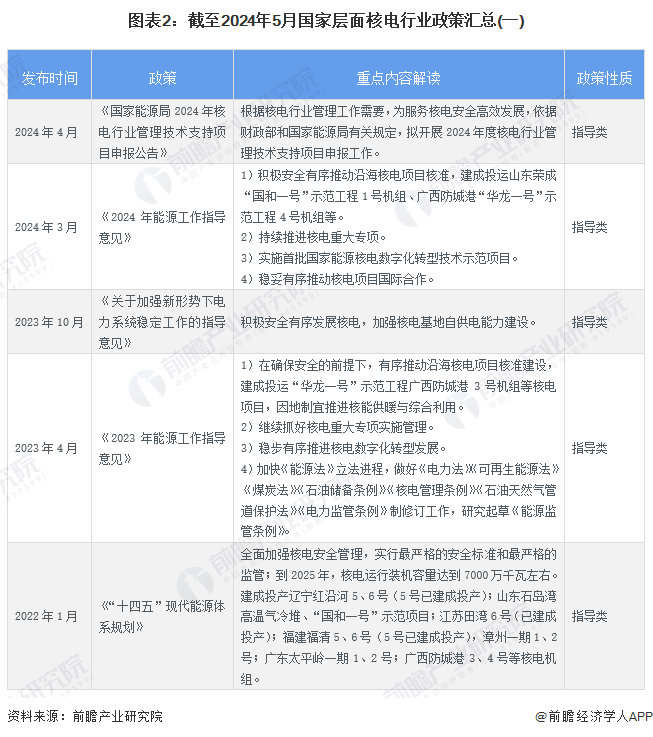 “十四五”时期,国家对核电行业的政策导向主要包括技术合作、安全生产、完善法律法规、数字化转型、国际合作等方面。截至2024年5月,国家层面核电行业政策汇总如下: