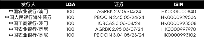 中资银行离岸人民币债LQA评分最高的五支债券