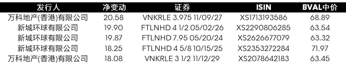 近期有报道称,国务院正就化解存量房产方案向部分监管部门和一些地方政府征求意见。杭州、西安、北京等城市相继出台了提振楼市的相关措施,包括放宽住房限购等。本周彭博一项追踪中国高收益美元债的指数(I29381US Index)价格上涨了2.1美分,达到2021年9月以来的最高水平,并势创七个月来的最大单周涨幅。其中万科旗下2027年到期的美元债每1美元面值买价报62.89美分,上涨约5.9美分。该债券于今年三月被多家机构下调为高收益级。