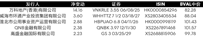 过去两周在彭博FIT平台交易的中资美元债中,债券成交额最大的前五大债券的发行人为Muthoot金融有限公司(MUTHIN 7 ⅛ 02/14/28 Corp为7.12亿美元,SK海力士株式会社(HYUELE 2 ⅜ 01/19/31 Corp为7.04亿美元),西太平洋银行公司(WSTP Float 04/16/26 Corp为6.38亿美元, WSTP 5.05 04/16/29 Corp为5.87亿美元),BOC AVIATION USA CORP(BOCAVI 5 ¼ 01/14/30 Corp为5.6亿美元)。