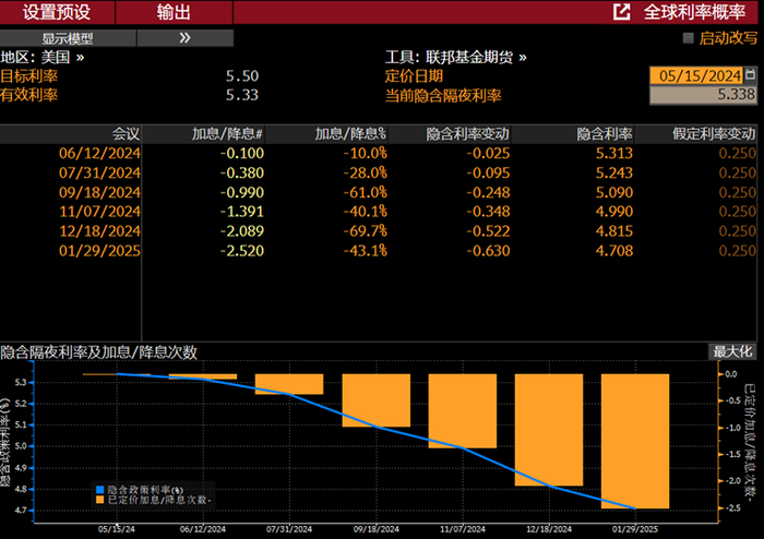 彭博终端WIRP :美联邦基金期货模型于数据公布当日预测美联储将在2024年降息两次