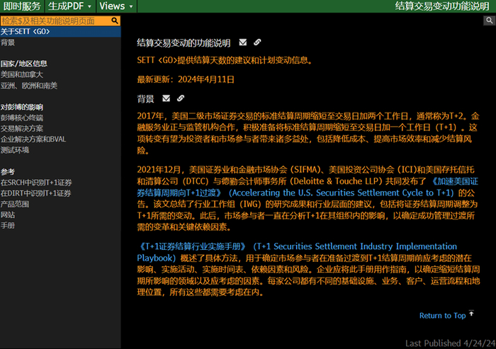 2023年2月15日,美国证券交易委员会(SEC)在一次公开会议上投票通过了将结算周期加快至一天的规则提案。因此,美国将于2024年5月28日过渡到T+1结算。加拿大资本市场协会(CCMA)亦宣布计划将加拿大市场过度至T+1结算周期,2024年5月27日生效。用户可以在终端页面运行SETT