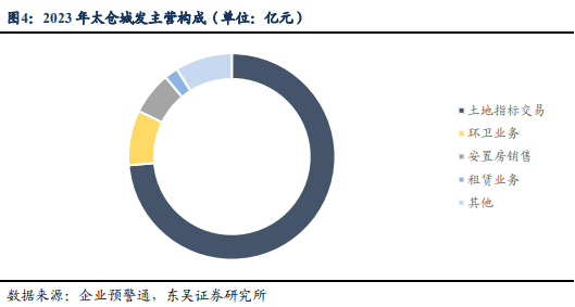 根据公司2023年财务报表披露,2023年公司总资产达204.64亿元,资产负债率71.16%,实现营业收入21.56亿元,归母净利润629.35万元。太仓城发主要业务为土地指标交易,2023年该板块业务占总营收比重为73.70%,其次是环卫业务和安置房销售,分别占总营收约8.62%和8.66%。