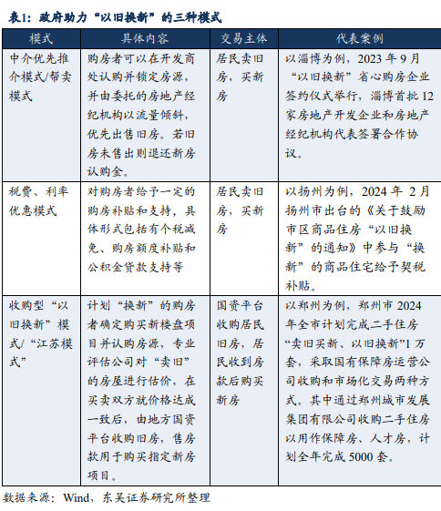 除了在需求端频频有政策出台,江苏省部分地方政府率先从供给端入手,推出收购型的“以旧换新”模式(又称“兜底模式”)。2023年9月28日,江苏省苏州市代管县级市太仓市率先试行由太仓城市发展集团有限公司主导的收购型“以旧换新”政策,首批试点的旧房集中在老城区中的小户型住房,而可选新房包括三个小区,均为城发集团开发。同年10月17日,江苏省连云港市也推出类似政策,收购主体为连云港市城建控股集团有限公司。2024年中上旬,江苏省内其他地市以及全国范围内其他省市也纷纷加入“兜底模式”的队列中。2024年4月2日起,江苏省南通市下辖县级市海安市商品房“以旧换新”购房政策落地,首批活动已惠及15套房产置换业主。同月27日,江苏省南京市试点推动存量房“以旧换新”,首批试点限额2000套。由于该类以地方国资平台为收购主体的“以旧换新”新模式最早在江苏省试点先行和普及推广,所以该模式也称作“江苏模式”。