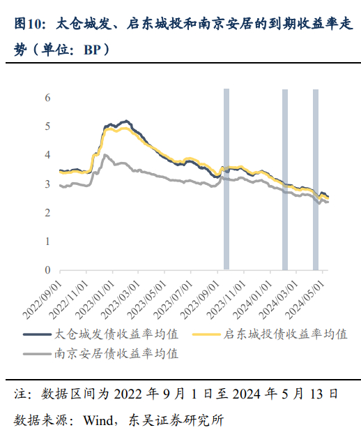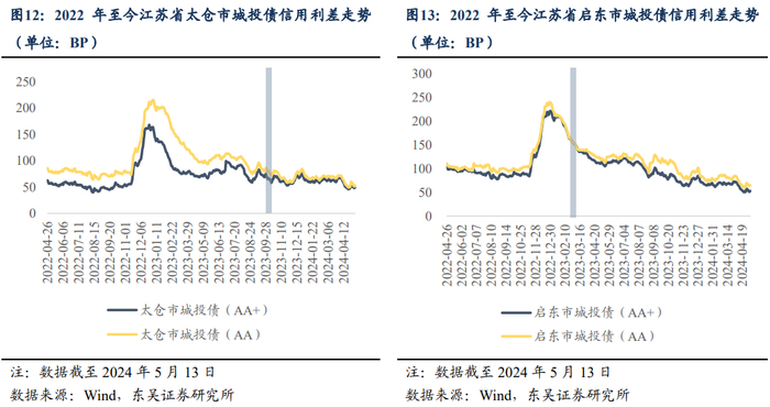 江苏省太仓市、启东市和南京市作为最早一批推行“江苏模式”存量房“以旧换新”的地区,在2023年9月28日、2024年2月16日和2024年4月27日分别出台相关政策。在政策推出前后,三地的指定执行城投平台存量债券平均收益率出现明显下行,分别下行约8.95BP、2.36BP、4.68BP,成交量显著提升,如太仓城发的6只存续债券在2023年9月份政策发布后交易开始活跃,自2023年5月起至2024年5月13日共成交48笔。此外,江苏省太仓市、启东市和南京市三地的整体城投债信用利差自2022年以来亦均呈现持续收窄态势。