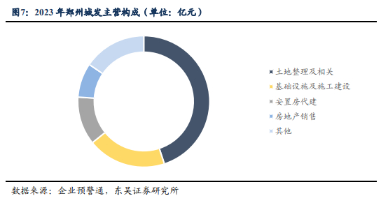 据公司2023年财务报表披露,公司总资产达1850.53亿元,资产负债率66.51%,实现营业收入94.12亿元,归母净利润28545.57万元。郑州城发主要业务为土地整理及相关,2023年该板块业务占总营收比重为44.95%,基础设施及施工建设、安置房代建和房地产销售业务板块营收分别占总营收约19.27%、11.85%和8.40%。