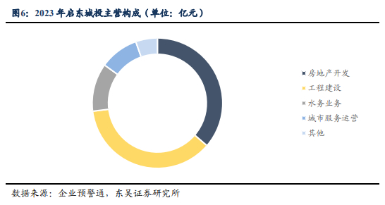 据公司2023年财务报表披露,公司总资产达768.14亿元,资产负债率58.49%,实现营业收入39.38亿元,归母净利润35945.63万元。启东城投主要业务为房地产开发和工程建设,2023年板块业务占总营收比重分别为36.30%和36.73%,其次为水务业务,占总营收约11.93%。