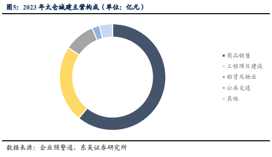 根据公司2023年财务报表披露,2023年公司总资产达401.13亿元,资产负债率59.42%,实现营业收入11.11亿元,归母净利润12625.24万元。太仓城建主要业务为商品销售,2023年该板块业务占总营收比重为60.94%,其次是工程项目建设和租赁及物业,分别占总营收约23.40%和9.36%。