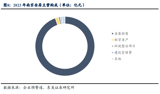 据公司2023年财务报表披露,公司总资产达1354.91亿元,资产负债率66.98%,实现营业收入180.56亿元,归母净利润15692.95万元。南京安居主要业务为房屋销售,2023年该板块业务占总营收比重达95.75%,其次是租赁房屋,占总营收1.64%。