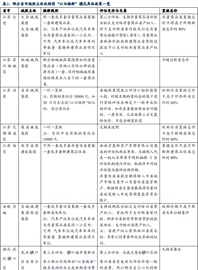“江苏模式”的存量房“以旧换新”的实施关键在于由政府指定的地方国资平台向购房者收购其旧房(二手房)并将其改造为人才房、安置房或保障性租赁住房,购房者则于购入新房时补缴差价,即旧房款用于抵换新房款。与过往模式的不同之处在于,尽管“帮卖模式”和税率利率优惠模式在一定程度上可提振购房者的购房意愿,但仍不足以恢复购房者对当前房地产市场的信心,所以此类从需求端入手的政策效果不及预期,新房市场售卖缓慢,二手房市场虽有大量挂牌但成交量未见起色。在此背景下,“江苏模式”应运而生,凭借地方国资平台的积极介入这一创新举措,不仅为当地的房地产市场注入一针强心剂,提振市场信心、促进房产成交,更对实施“以旧换新”政策的城投平台自身的库存商品房去化、现金流改善以及在资本市场融资能力提升均大有裨益。因此,我们推荐投资者关注全国各大已开始试点或有意向实施收购型“以旧换新”政策的区域,包括地市级和区县级范围,并重点布局此类区域内已开启“以旧换新”活动或未来有能力开启该活动的城投平台。