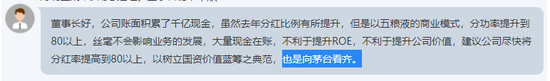 投资者提及的上述友商系贵州茅台(600519)。更有投资者直接建议五粮液:“尽快将分红率提高到80%以上,以树立国资价值蓝筹之典范,也是向茅台看齐。”
