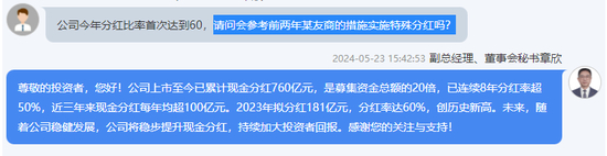 “请问会参考前两年某友商的措施实施特殊分红吗?”5月23日下午,投资者在五粮液(000858)2023年度及2024年第一季度业绩说明会上提问。