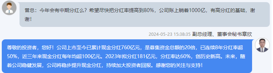 截至2024年一季度末,五粮液货币资金余额达1158.26亿元。章欣回应:“未来,随着公司稳健发展,公司将稳步提升现金分红,持续加大投资者回报。”