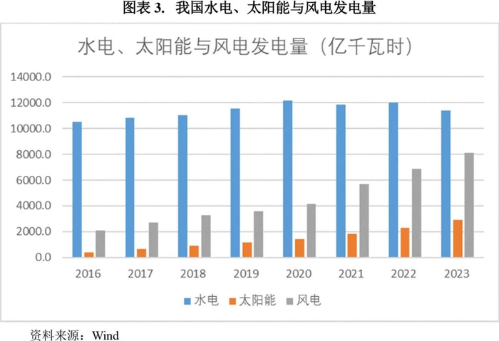 从电力供给看,我国电力生产平稳,可再生能源发电实现新突破。2021-2023年,我国规模以上工业发电量分别为8.1万亿千瓦时、8.4万亿千万时、8.9万亿千瓦时,分别比上年增长8.1%、2.2%、5.2%。其中,2023年我国火力发电量6.2万亿千瓦时,比上年增长6.1%;水电、核电、风电和太阳能发电等清洁能源发电2.7万亿千瓦时,比上年增长3.1%。全国水电、风电和太阳能发电等可再生能源发电装机规模再创新高,超过14亿千瓦。
