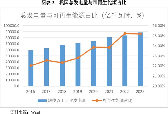 立足于“富煤缺油少气”的资源禀赋,为了持续推进高质量发展,实现发展方式的转型升级,近年来我国出台了一系列政策文件,包括行业发展规划、用地政策、年度工作指引和标准体系框架等,以实现“碳达峰、碳中和”的总体目标。在政策支持下,近年来我国能源供给结构不断优化,清洁能源占比呈上升趋势,截至2023年末,水电、太阳能和风电发电量占比已达25%以上,自2016年以来年均复合增长率超过8%。未来光伏、风电等清洁能源的发展或将进一步加快,在国家能源结构中的地位或将持续凸显。