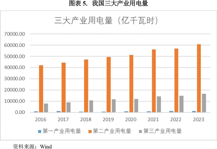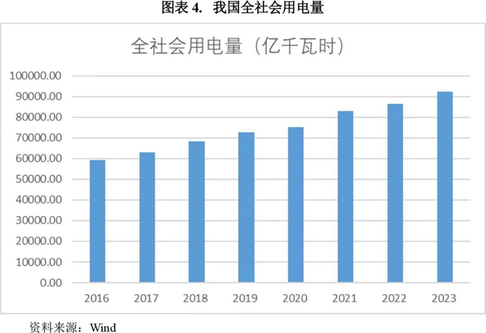从电力需求来看,近年来我国电力需求保持增长势头。2021-2023年,全国全社会用电量分别为8.31万亿千瓦时、8.64万亿千瓦时和9.22万亿千万时,同比增长10.3%、3.6%和6.7%。2021年以来,受益于经济社会的全面恢复,全社会用电量持续增长,每年增幅在3000亿千万时以上。2023年三大产业用电量均较上年大幅增长,增速均超过按不变价格计算的当年GDP增长率,其中第一产业用电量1278亿千瓦时,同比增长11.5%;第二产业用电量6.07万亿千瓦时,同比增长6.5%;第三产业用电量1.67万亿千瓦时,同比增长12.2%。