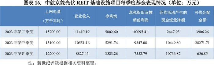 根据中航京能光伏REIT发布的季度报告,该基金合并口径营业收入主要来自项目公司发电收入,另有部分利息收入。2023年第二季度和第三季度售电收入较多,系因季节性因素和电力调度较集中于这两个季度所致。地面光伏项目的发电量主要受光资源、天气变化等自然环境因素影响,在一定范围内存在波动属正常情况。冬季昼短夜长、太阳高度角小,太阳辐射能量较少,因此一季度和四季度光伏电站发电量在全年占比相对较少。此外,2023年第四季度榆林光伏项目发电站发生设备故障,亦导致该季度营业收入下降,且由于计入2024年1月已归还的保理本金导致当季未来合理相关支出预留金额较大,当季可供分配金额较少。